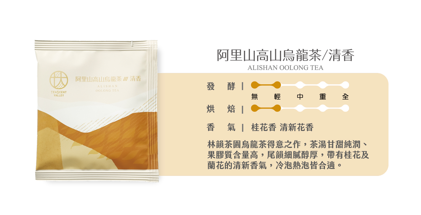 林韻茶園烏龍茶得意之作,茶湯甘甜純潤、果膠質含量高,尾韻細膩醇厚,帶有桂花及蘭花的清新香氣,冷泡熱泡皆合適。